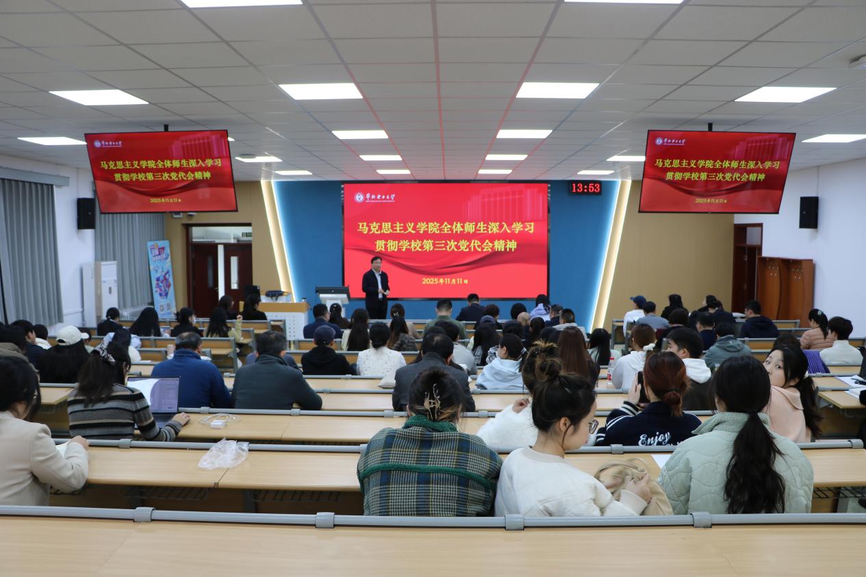 他强调,马克思主义学院作为学校思政课教育教学的主阵地,要把学习贯彻党的二十届四中全会精神和学校第三次党代会精神作为当前和今后一个时期的重要任务,要进一步提高政治站位,在学习贯彻四中全会和学校党代会精神上先行一步,充分发挥马克思主义理论学科和专业优势,学深悟透,将中央全会精神和学校党代会精神高效融入课堂教学、科学研究与社会服务之中,切实把思想和行动统一到学校党委决策部署上来,把学习成果转化为推动学院建设和学校发展的实际行动,以高度的责任感和使命感,不断深化思政课改革创新,提升育人实效,为学校“双一流”建设贡献马院智慧和力量。