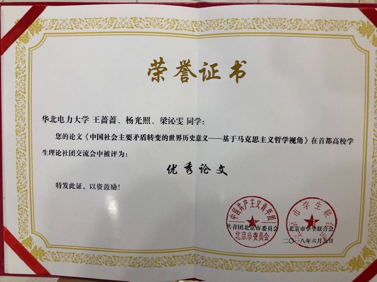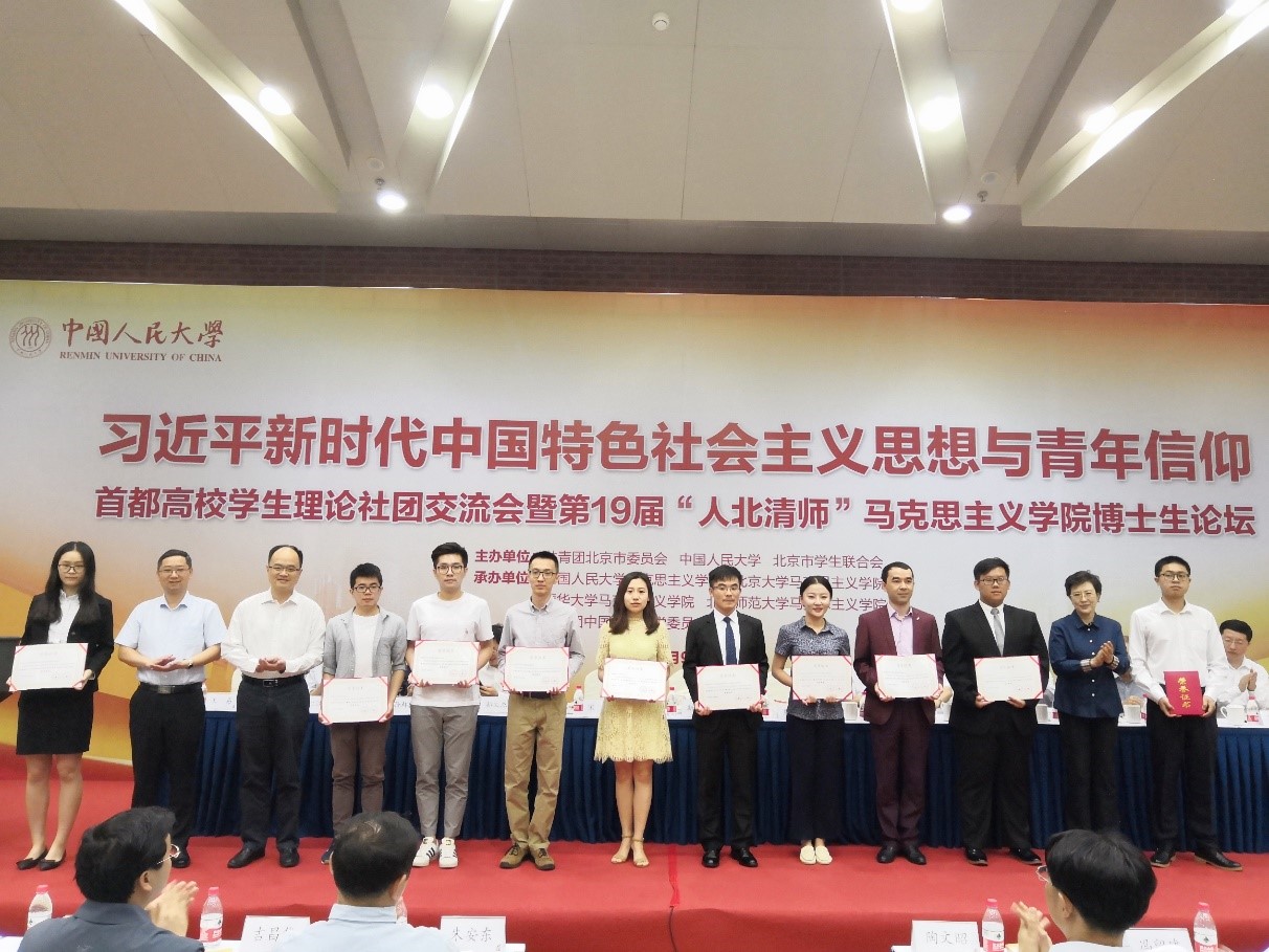 6月9日,习近平新时代中国特色社会主义思想与青年信仰——首都高校学生理论社团交流会暨第19届“人北清师”马克思主义学院博士生论坛在中国人民大学世纪馆举行。我校理论社团“华北电力大学习近平新时代中国特色社会主义思想学习研究会”获评“首都高校学习习近平新时代中国特色社会主义思想十佳学生理论社团”荣誉称号,马院研究生二年级学生王蔷蔷及其社团成员撰写的论文《中国社会主要矛盾转变的世界历史意义——基于马克思主义哲学视角》获评交流会优秀论文。