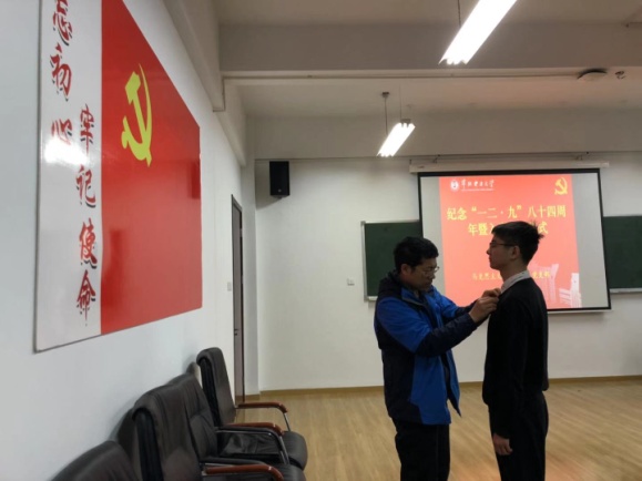 接着,由武昌杰老师为两名新发展的党员同志戴上党徽。
