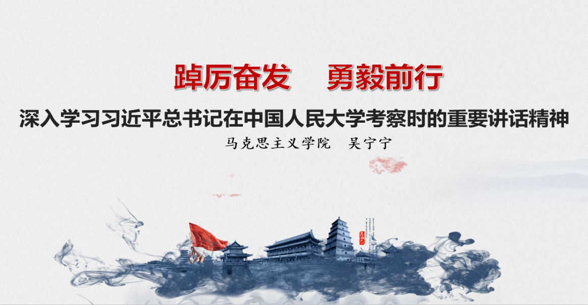 首先,马克思主义学院原理与思修党支部书记吴宁宁老师以《踔厉奋发、勇毅前行——深入学习习近平总书记在中国人民大学考察时的重要讲话精神》为题,进行了此次主题党日活动的导学,导学围绕三个部分展开。第一部分:习近平总书记的“青年节”。分析了2013-2022连续十年在五四期间总书记给青年的寄语。第二部分:中国人民大学考察时的讲话要点:分别从关于走出建设中国特色、世界一流大学的新路;关于思想政治理论课、大中小学思政课一体化建设;关于继承优良传统、赓续红色血脉;关于教师队伍建设和教师自我修养;关于文献古籍典藏保护利用和数字化学术资源平台建设;关于加快构建中国特色哲学社会科学;关于新时代新征程中国青年的奋斗目标和前行方向等六个方面进行了介绍。吴宁宁老师总结指出,习近平总书记在中国人民大学考察时的讲话蕴含了以习近平同志为核心的党中央对马克思主义青年观和青年工作方法论的新思考、新要求,进一步丰富和发展了习近平总书记关于青年工作的重要思想,对于做好新时代党的青年工作具有重大理论意义和实践意义。第三部分:学习体会。吴宁宁老师表示,思政课教师要讲好信仰之“理”,真学、真信、真懂、真用马克思主义。思政课教师要做好“经师”和“人师”,不仅要加强理论修养,更要加强自身修养,要心怀“国之大者”“党之大者”“师之大者”,遵循思政课教育规律,既要积极探索、锐意创新,又要绵绵用力,久久为功。