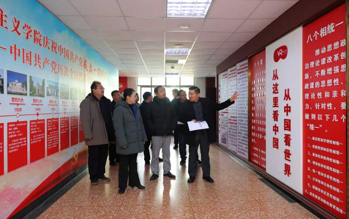 专家组实地走访马克思主义学院,通过随堂听课、体验 VR 教学、参观递进式思政主题展、查阅支撑材料、与师生座谈等多种形式开展考察。