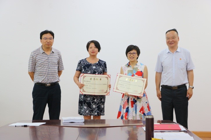 之后党总支副书记、副院长(主持工作)孙平同志,党总支书记蔡利民同志为优秀党员张月想、王旭琰,先进支部概论与纲要党支部颁发荣誉证书。
