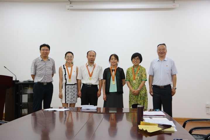 全体总支委员与校级优秀党员许丹娜,校级先进支部书记、校级优秀党务工作者侯丹娟,校级优秀党员赵锦锦合影。